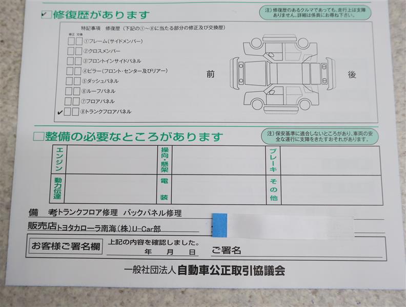 ※ 「修復歴あり」の場合、修復部位の詳細につきましては、販売店へお問い合わせください。