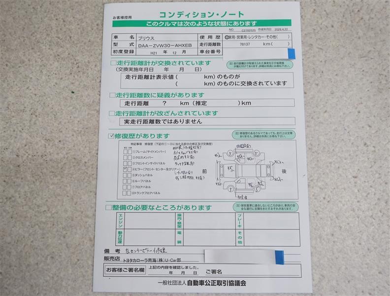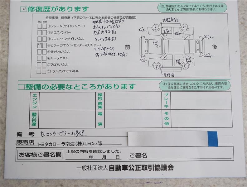 ※ 「修復歴あり」の場合、修復部位の詳細につきましては、販売店へお問い合わせください。