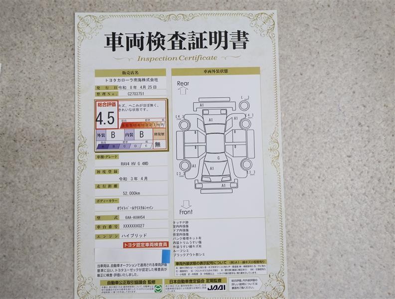 トヨタ車のプロの検査員が実施した「車両検査証明書」付き!車両の状態をこれ1枚でチェックできます!