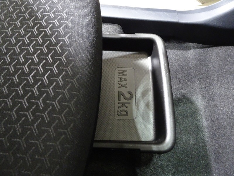 靴などを入れておくのに便利な助手席シート下の収納トレイ。
