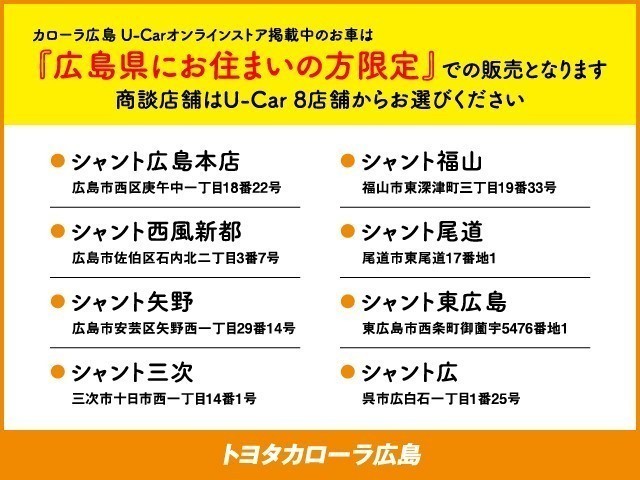 お車の確認、商談はお近くのシャント店で!(カローラ広島 U-Carオンラインストアへのご来場はできません)