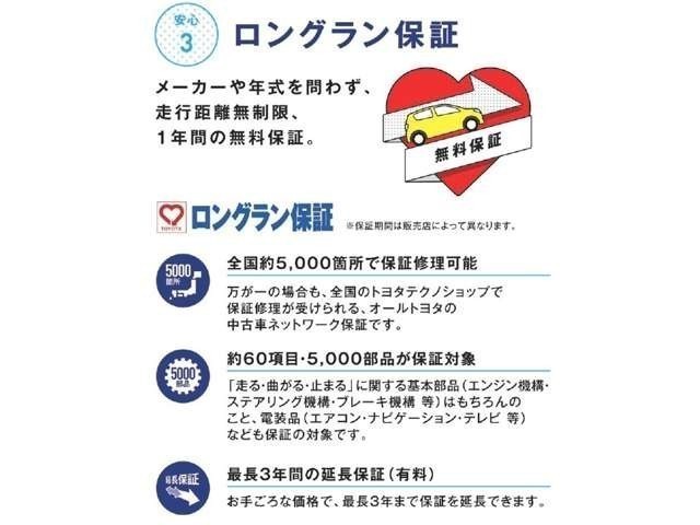 通常のロングラン保証1年(基本保証)に延長保証+1年(=2年保証)を付帯し、さらにプロケア点検2回・12ヶ月点検1回をお得なセット料金にしたメンテナンスパックを合わせたプランで、納車後の安心をお届けします。