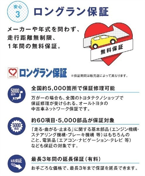 通常のロングラン保証1年(基本保証)に延長保証+1年(=2年保証)を付帯し、さらにプロケア点検2回・12ヶ月点検1回をお得なセット料金にしたメンテナンスパックを合わせたプランで、納車後の安心をお届けします。
