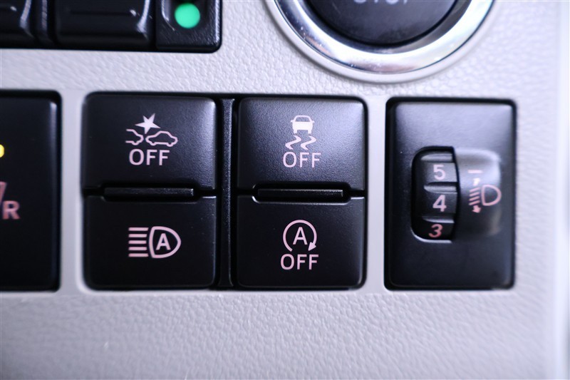 スマートアシスト、オートマチックハイビーム、トラクションコントロール(横滑り防止機能)、アイドリングストップ等のスイッチが配置されています。