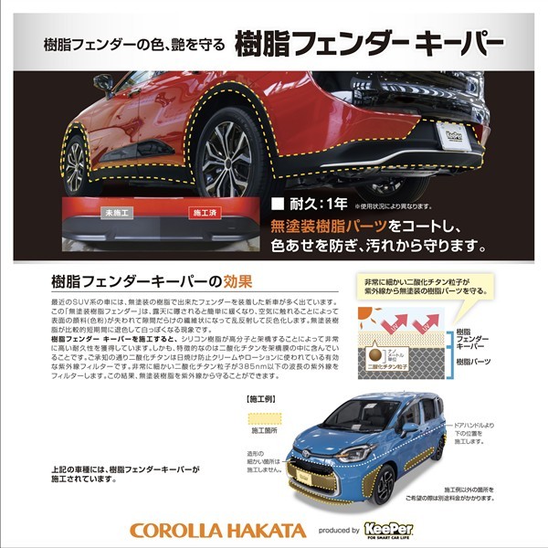 カローラ博多では、樹脂部品にフェンダーkeeperを施工済みです!SUVの樹脂フェンダーなどの色あせを防止し、きれいな状態を保つことができます!耐久年数は1年※使用状況により異なります。