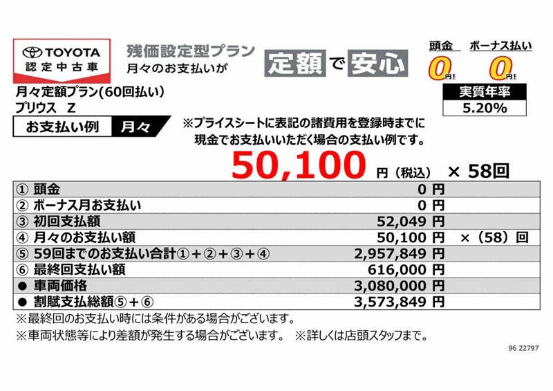 • 支払回数60回(5年)、実質年率5.2%、割賦元金3,080,000円、初回支払額52,049円、最終回支払額616,000円、割賦支払総額3,573,849円