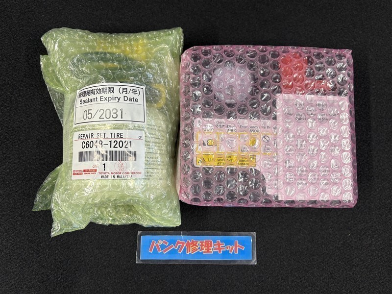 タイヤがパンクした時の応急修理キットです。スペアタイヤがないことにより軽量化でき環境にもいいです。