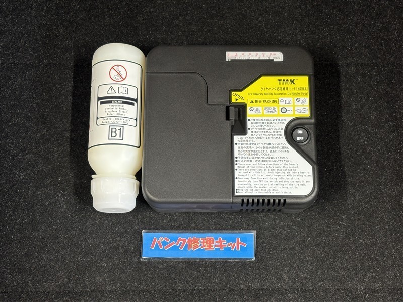 タイヤがパンクした時の応急修理キットです。スペアタイヤがないことにより軽量化でき環境にもいいです。