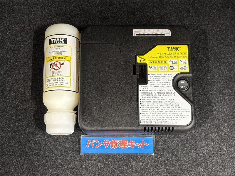 タイヤがパンクした時の応急修理キットです。スペアタイヤがないことにより軽量化でき環境にもいいです。