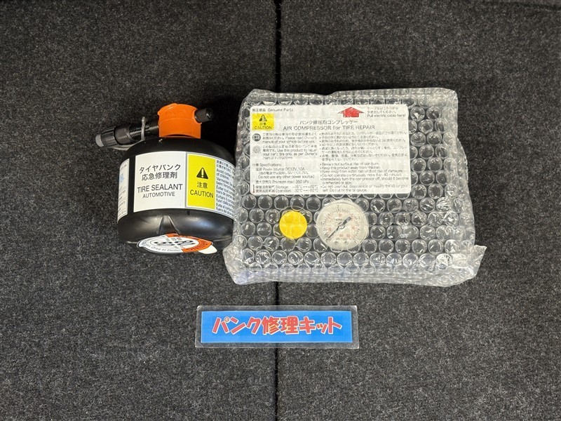 タイヤがパンクした時の応急修理キットです。スペアタイヤがないことにより軽量化でき環境にもいいです。