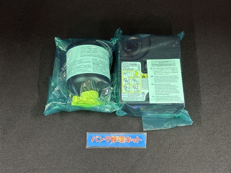 タイヤがパンクした時の応急修理キットです。スペアタイヤがないことにより軽量化でき環境にもいいです。