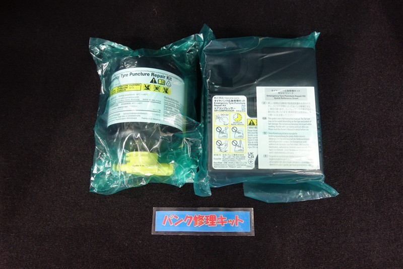 タイヤがパンクした時の応急修理キットです。スペアタイヤがないことにより軽量化でき環境にもいいです。
