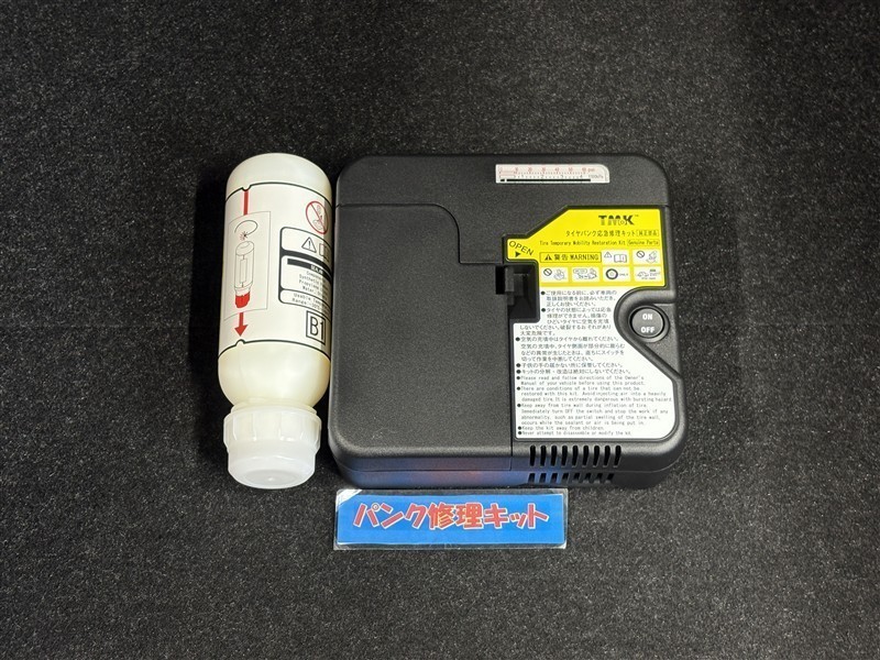 タイヤがパンクした時の応急修理キットです。スペアタイヤがないことにより軽量化でき環境にもいいです。
