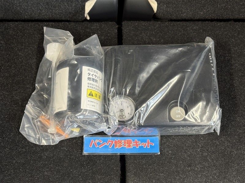 タイヤがパンクした時の応急修理キットです。スペアタイヤがないことにより軽量化でき環境にもいいです。