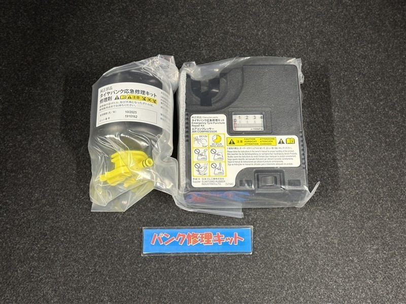 タイヤがパンクした時の応急修理キットです。スペアタイヤがないことにより軽量化でき環境にもいいです。