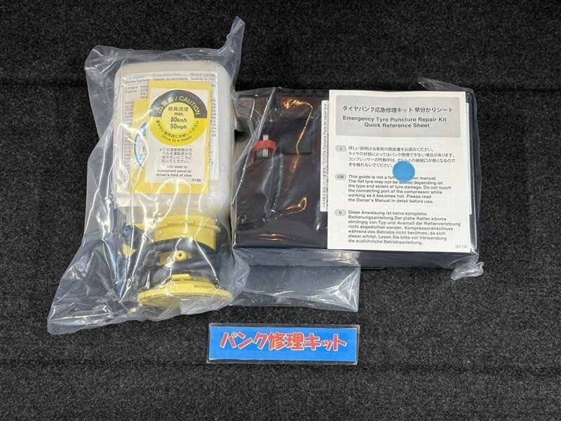 タイヤがパンクした時の応急修理キットです。スペアタイヤがないことにより軽量化でき環境にもいいです。