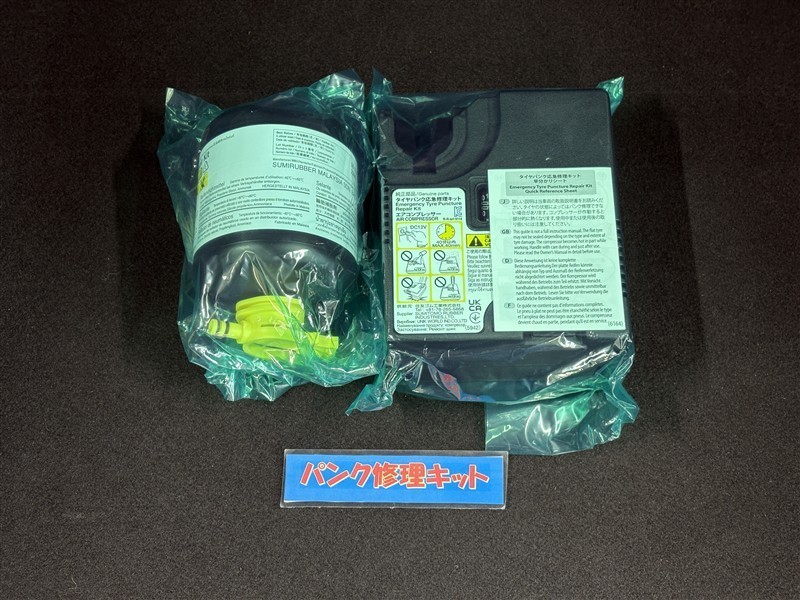 タイヤがパンクした時の応急修理キットです。スペアタイヤがないことにより軽量化でき環境にもいいです。
