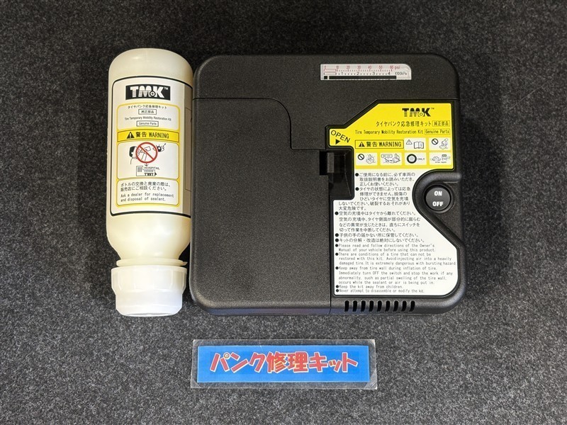 タイヤがパンクした時の応急修理キットです。スペアタイヤがないことにより軽量化でき環境にもいいです。