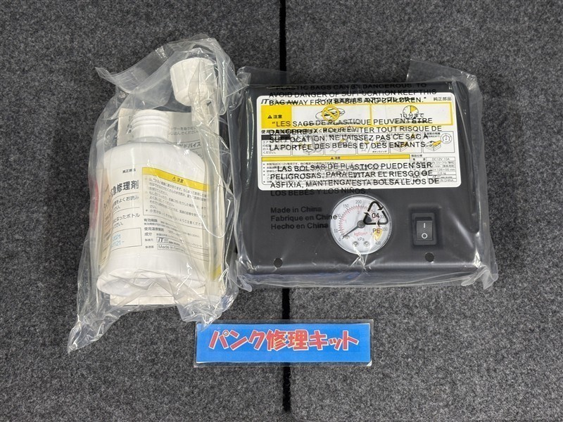 タイヤがパンクした時の応急修理キットです。スペアタイヤがないことにより軽量化でき環境にもいいです。
