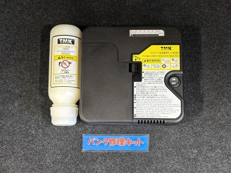 タイヤがパンクした時の応急修理キットです。スペアタイヤがないことにより軽量化でき環境にもいいです。