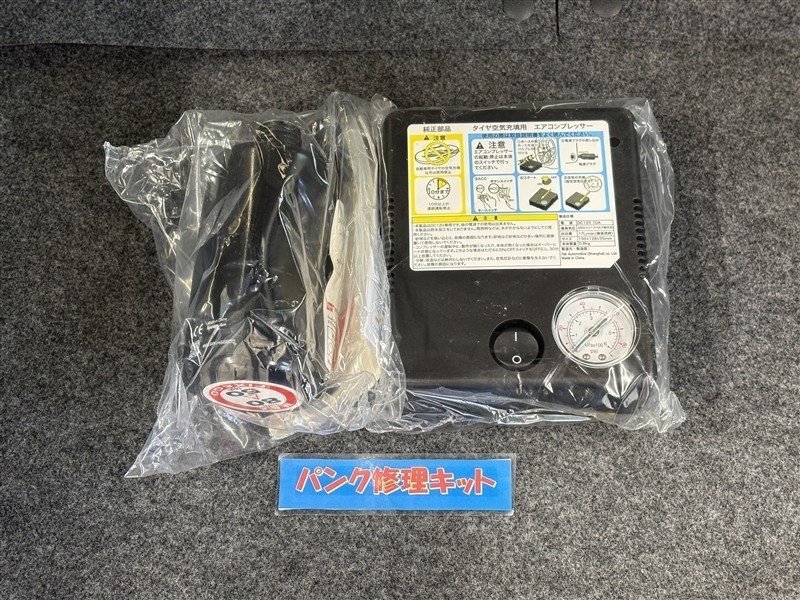タイヤがパンクした時の応急修理キットです。スペアタイヤがないことにより軽量化でき環境にもいいです。