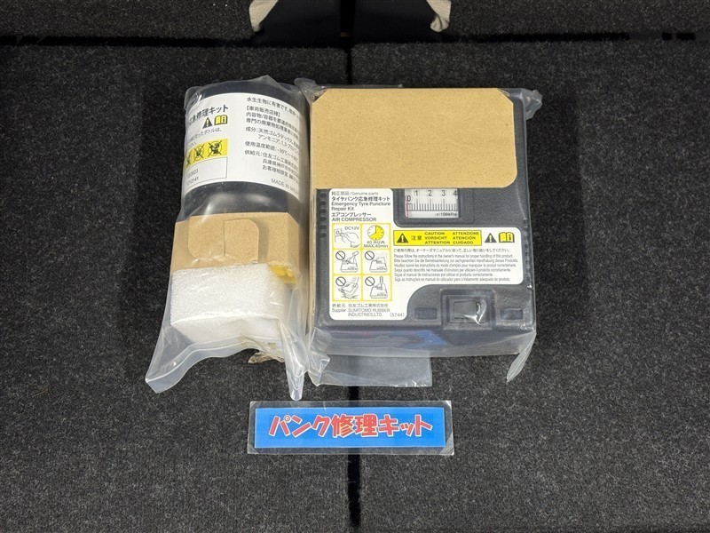 タイヤがパンクした時の応急修理キットです。スペアタイヤがないことにより軽量化でき環境にもいいです。