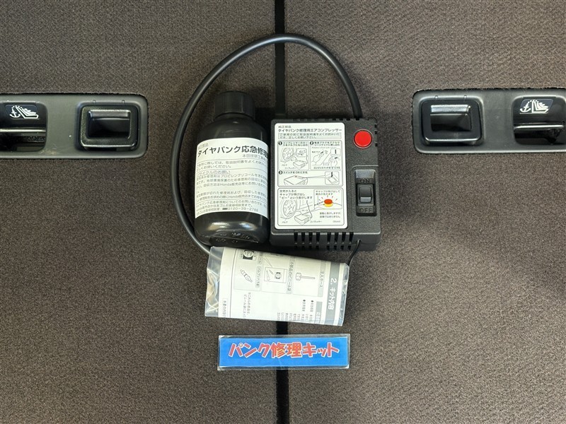 タイヤがパンクした時の応急修理キットです。スペアタイヤがないことにより軽量化でき環境にもいいです。