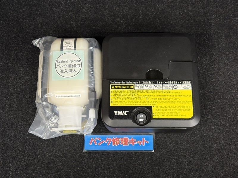 タイヤがパンクした時の応急修理キットです。スペアタイヤがないことにより軽量化でき環境にもいいです。