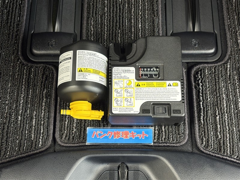 タイヤがパンクした時の応急修理キットです。スペアタイヤがないことにより軽量化でき環境にもいいです。
