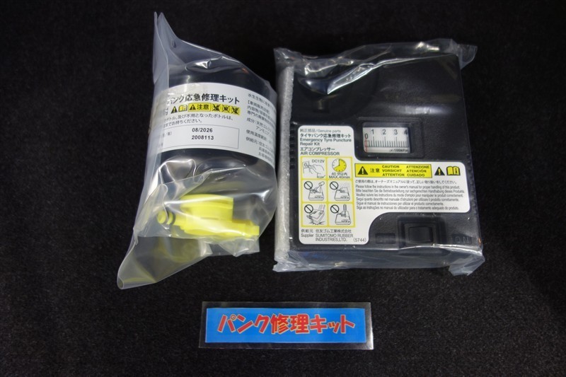 タイヤがパンクした時の応急修理キットです。スペアタイヤがないことにより軽量化でき環境にもいいです。