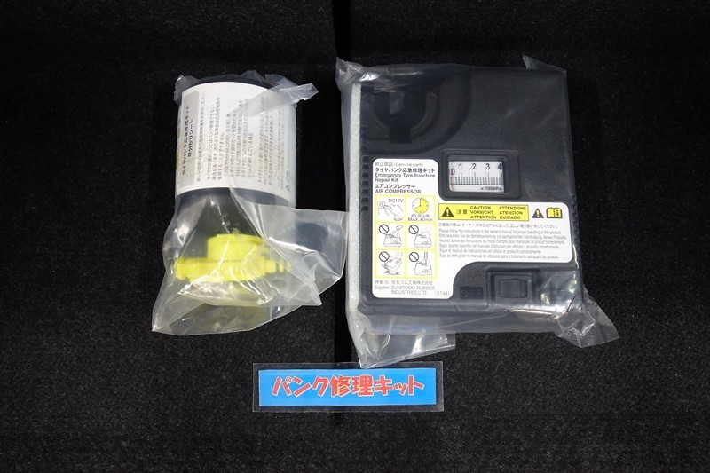 タイヤがパンクした時の応急修理キットです。スペアタイヤがないことにより軽量化でき環境にもいいです。