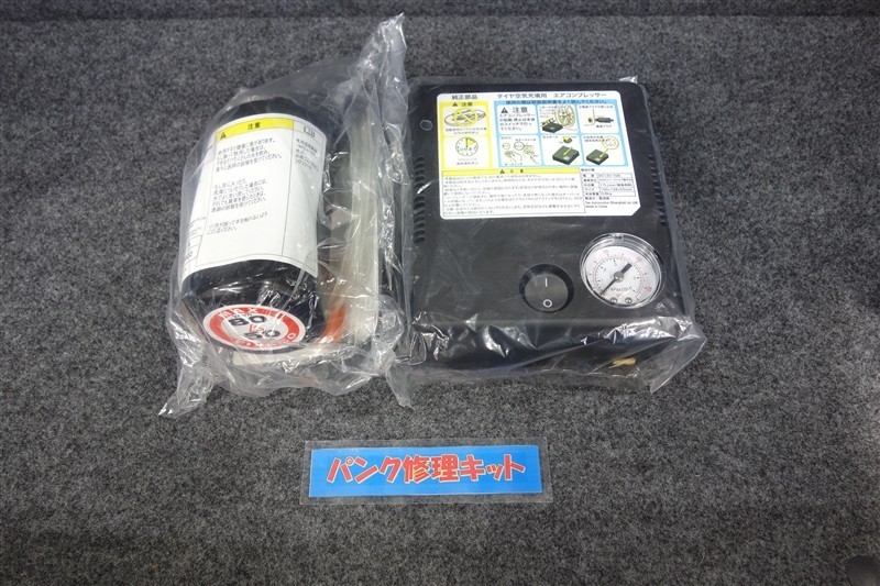 タイヤがパンクした時の応急修理キットです。スペアタイヤがないことにより軽量化でき環境にもいいです。