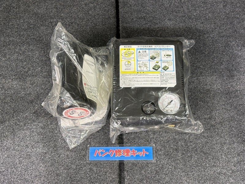 タイヤがパンクした時の応急修理キットです。スペアタイヤがないことにより軽量化でき環境にもいいです。