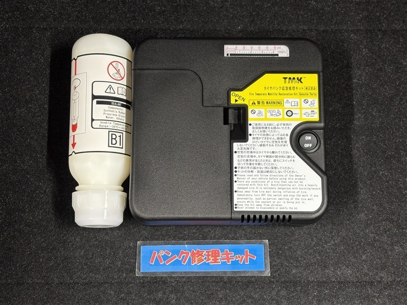 タイヤがパンクした時の応急修理キットです。スペアタイヤがないことにより軽量化でき環境にもいいです。