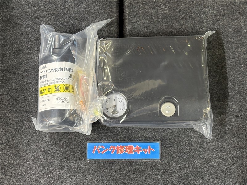 タイヤがパンクした時の応急修理キットです。スペアタイヤがないことにより軽量化でき環境にもいいです。