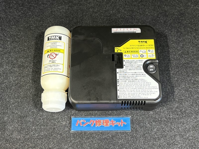 タイヤがパンクした時の応急修理キットです。スペアタイヤがないことにより軽量化でき環境にもいいです。