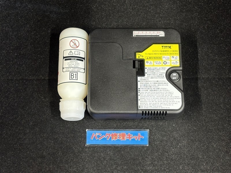 タイヤがパンクした時の応急修理キットです。スペアタイヤがないことにより軽量化でき環境にもいいです。