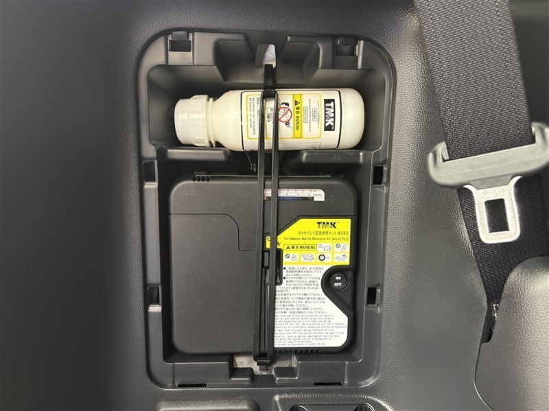 タイヤがパンクした時の応急修理キットです。スペアタイヤがないことにより軽量化でき環境にもいいです。