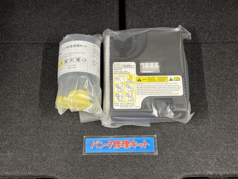 タイヤがパンクした時の応急修理キットです。スペアタイヤがないことにより軽量化でき環境にもいいです。