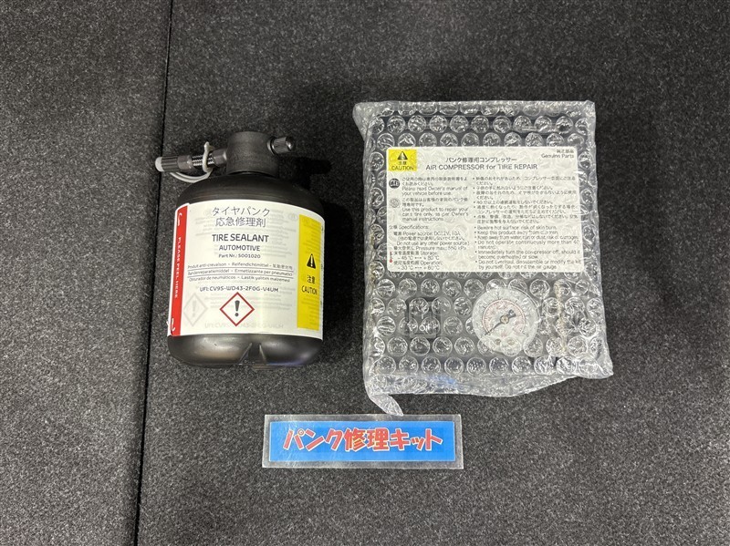 タイヤがパンクした時の応急修理キットです。スペアタイヤがないことにより軽量化でき環境にもいいです。