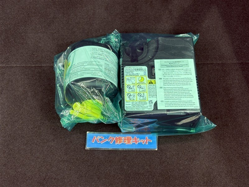 タイヤがパンクした時の応急修理キットです。スペアタイヤがないことにより軽量化でき環境にもいいです。