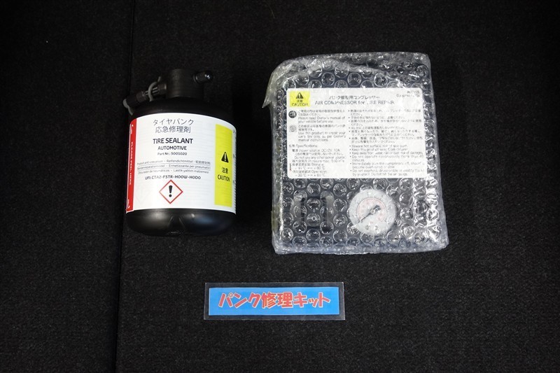 タイヤがパンクした時の応急修理キットです。スペアタイヤがないことにより軽量化でき環境にもいいです。