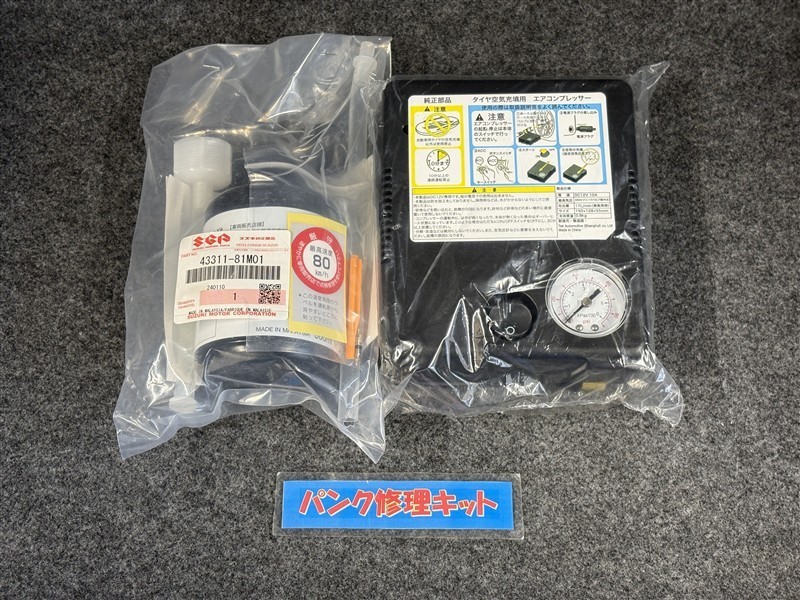 タイヤがパンクした時の応急修理キットです。スペアタイヤがないことにより軽量化でき環境にもいいです。