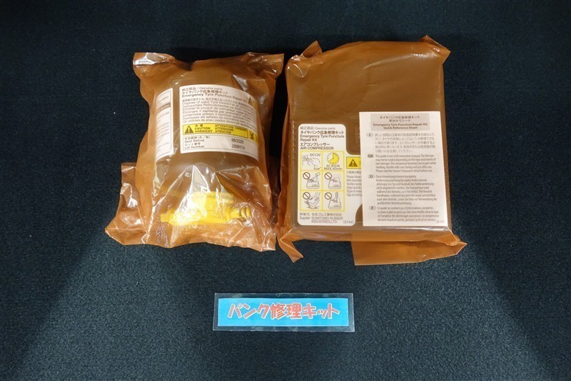 タイヤがパンクした時の応急修理キットです。スペアタイヤがないことにより軽量化でき環境にもいいです。