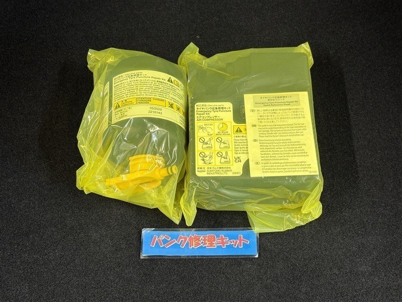 タイヤがパンクした時の応急修理キットです。スペアタイヤがないことにより軽量化でき環境にもいいです。