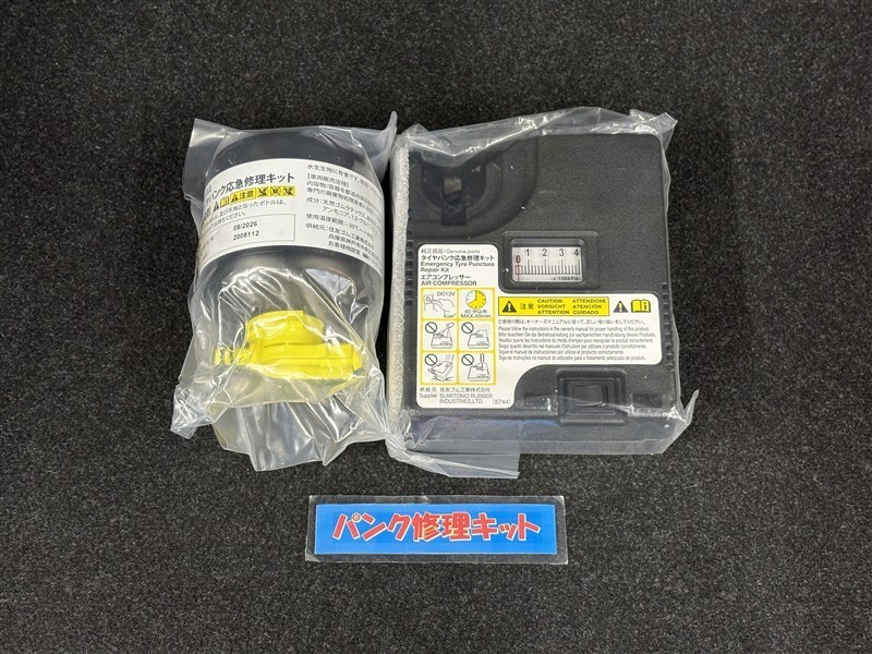タイヤがパンクした時の応急修理キットです。スペアタイヤがないことにより軽量化でき環境にもいいです。