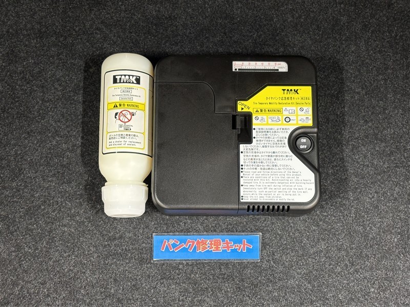タイヤがパンクした時の応急修理キットです。スペアタイヤがないことにより軽量化でき環境にもいいです。