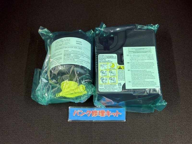タイヤがパンクした時の応急修理キットです。スペアタイヤがないことにより軽量化でき環境にもいいです。