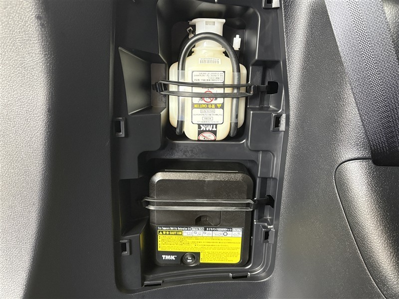 タイヤがパンクした時の応急修理キットです。スペアタイヤがないことにより軽量化でき環境にもいいです。
