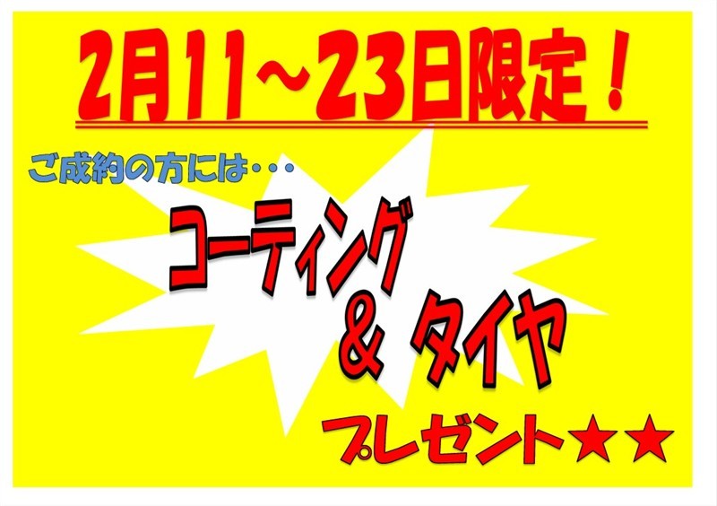 2月23日まで!当店限定企画!こちらのお車に限り当社指定コーティング&新品タイヤご成約プレゼント!!詳しくはスタッフまでお願いいたします。